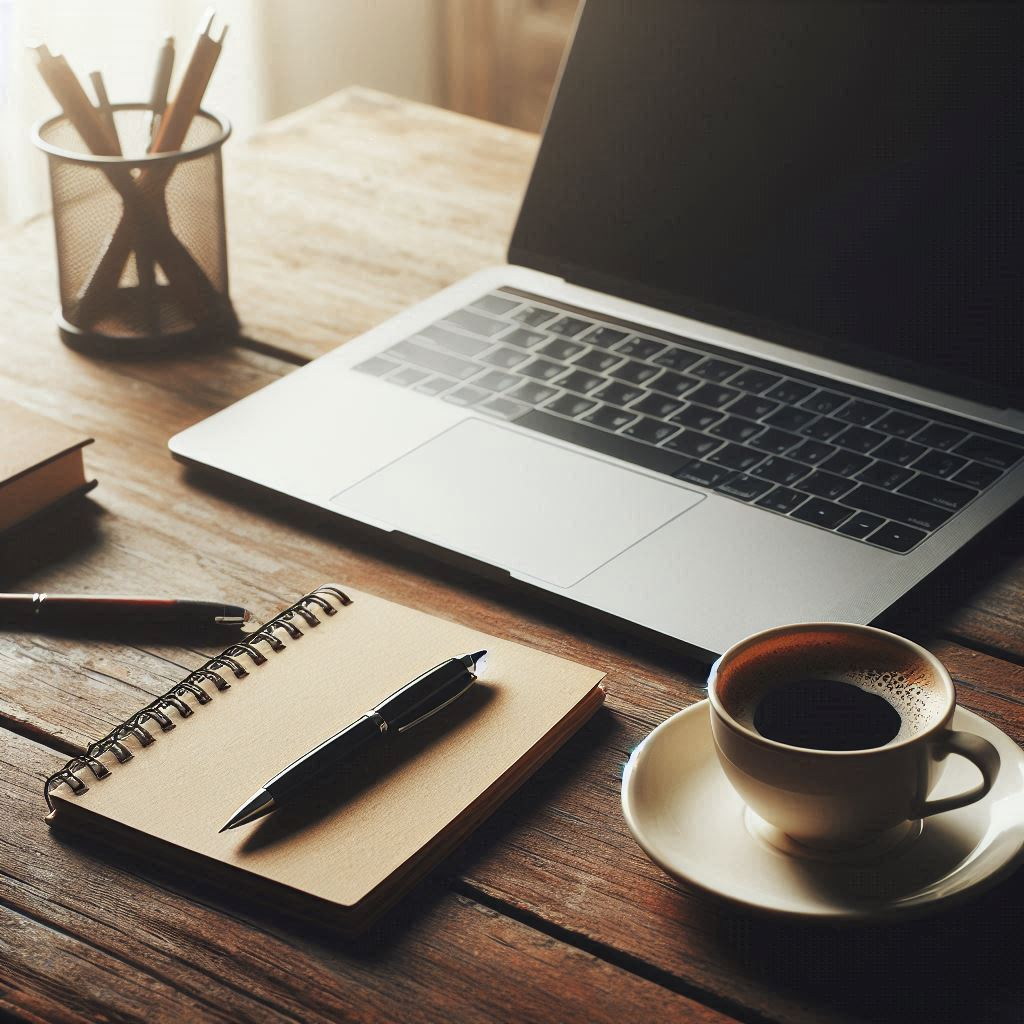 A photo of a laptop, pen and cup a cup of coffee on an old table