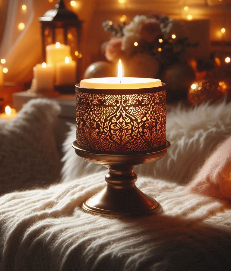 Luxe Glow is a visually captivating digital photograph that brings together elegance, texture, and warmth. At the heart of the image, an intricately patterned candle holder rests atop a plush, fur-like surface. Its golden light glows through ornate cutouts, casting enchanting patterns across its surroundings. Soft fairy lights and floral accents in the background elevate the scene into a warm sanctuary of comfort and style.