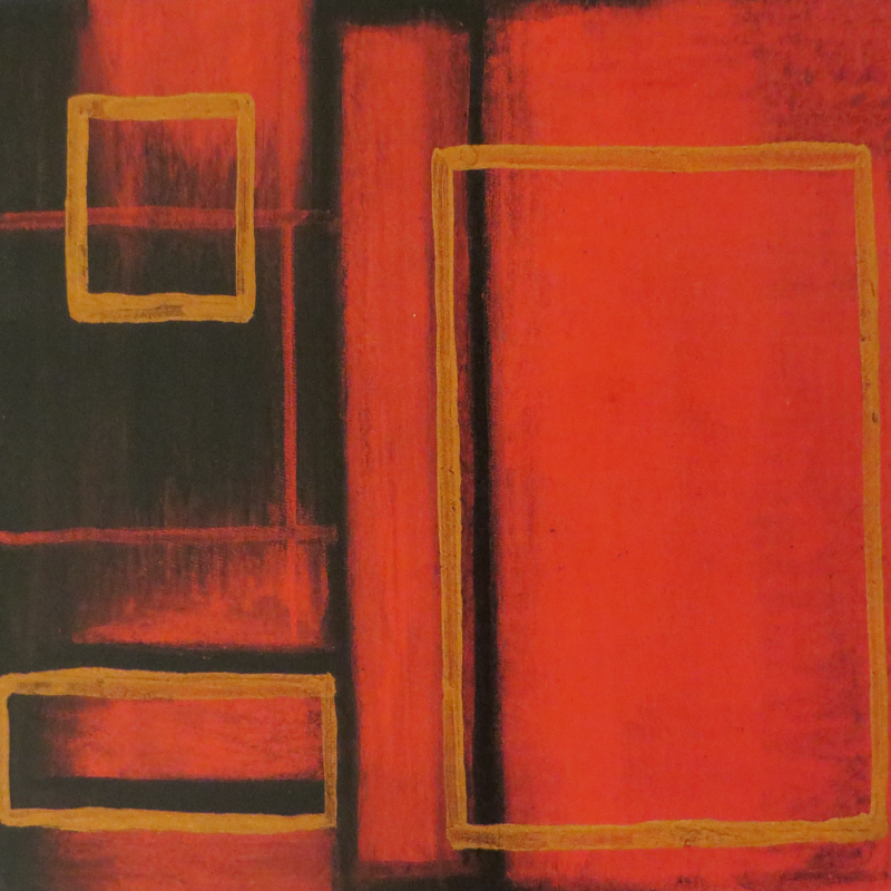 A striking red and black geometric abstract acrylic painting featuring golden rectangles that evoke structure and strength.