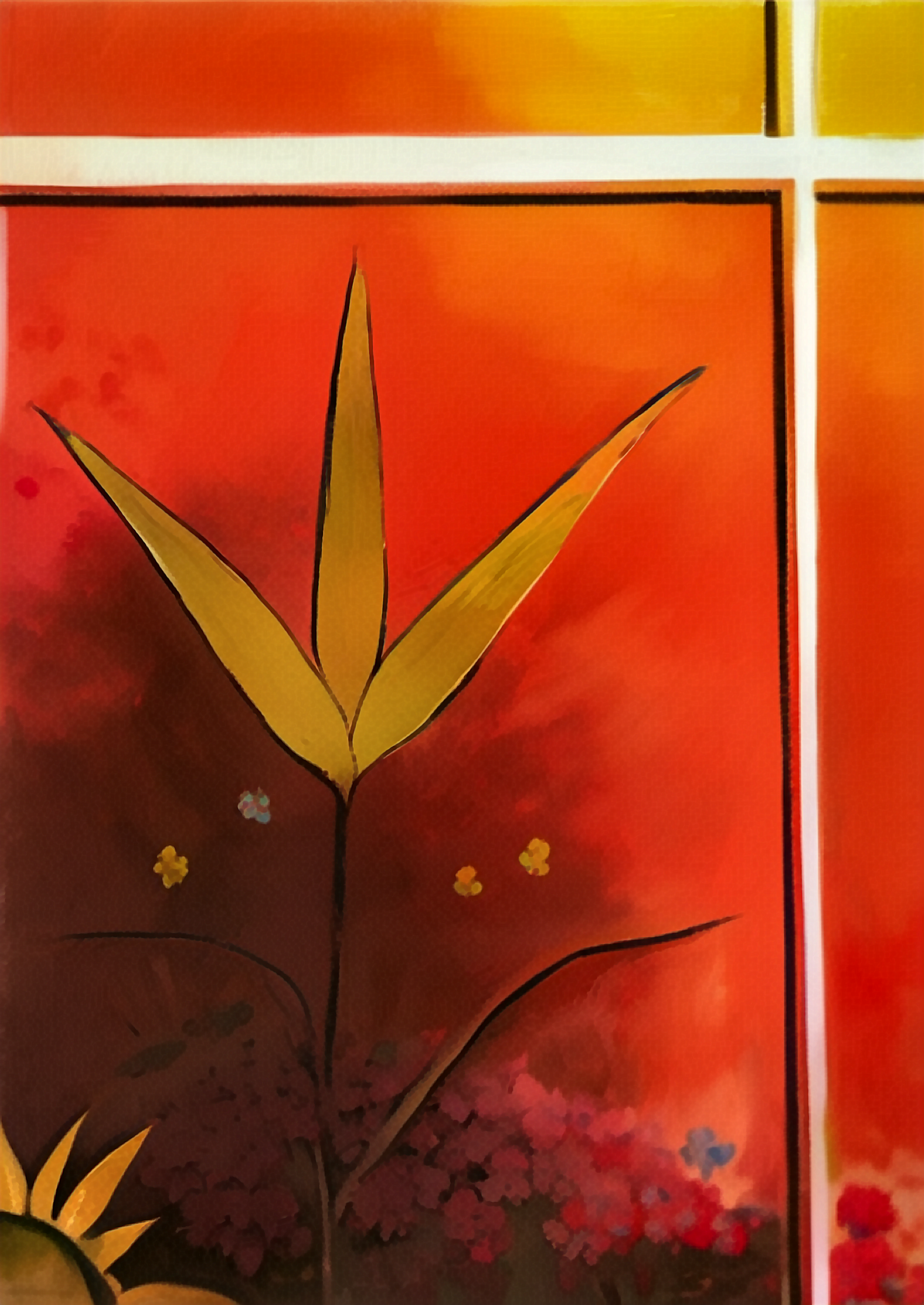 “Golden Bloom” captures the serene beauty of nature through abstract expression. Set against a warm gradient of glowing sunset hues—ranging from deep reds to amber yellows—this acrylic painting features a bold golden leaf plant as its focal point. The minimalist window-like grid adds a sense of structure, while soft floral elements bloom gently at the base. This artwork blends nature and geometry with passion and peace, making it perfect for modern interiors, boho decor, or anyone seeking a calm yet radiant visual presence on their walls.