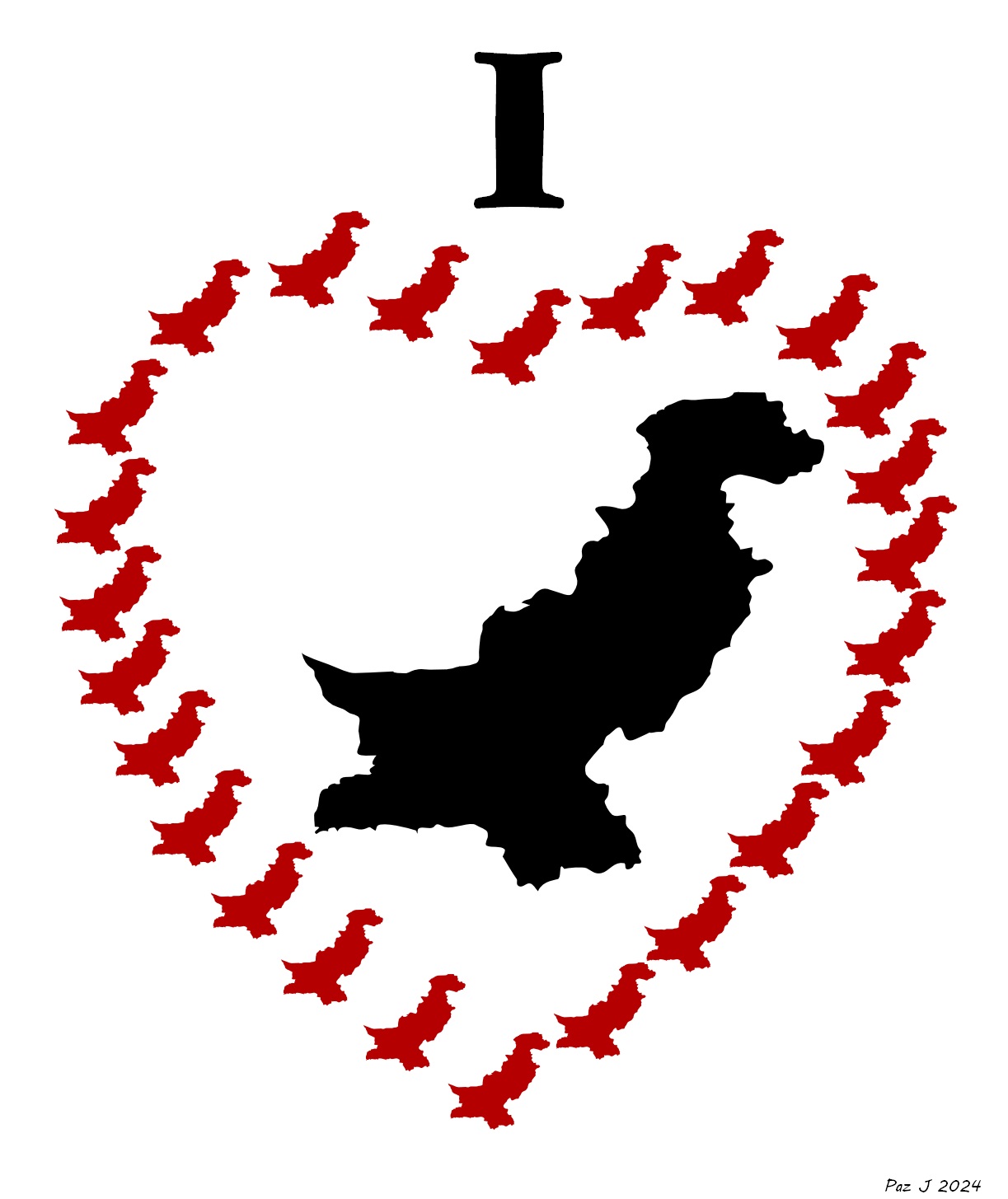 Show your love for Pakistan with this powerful and minimalist digital artwork titled “I Love Pakistan Map.” The central silhouette of Pakistan in bold black stands proud, surrounded by a heart shape composed of red mini Pakistan map icons. Topped with a bold “I”, this piece visually spells out “I ♥ Pakistan” in a modern and graphic way.