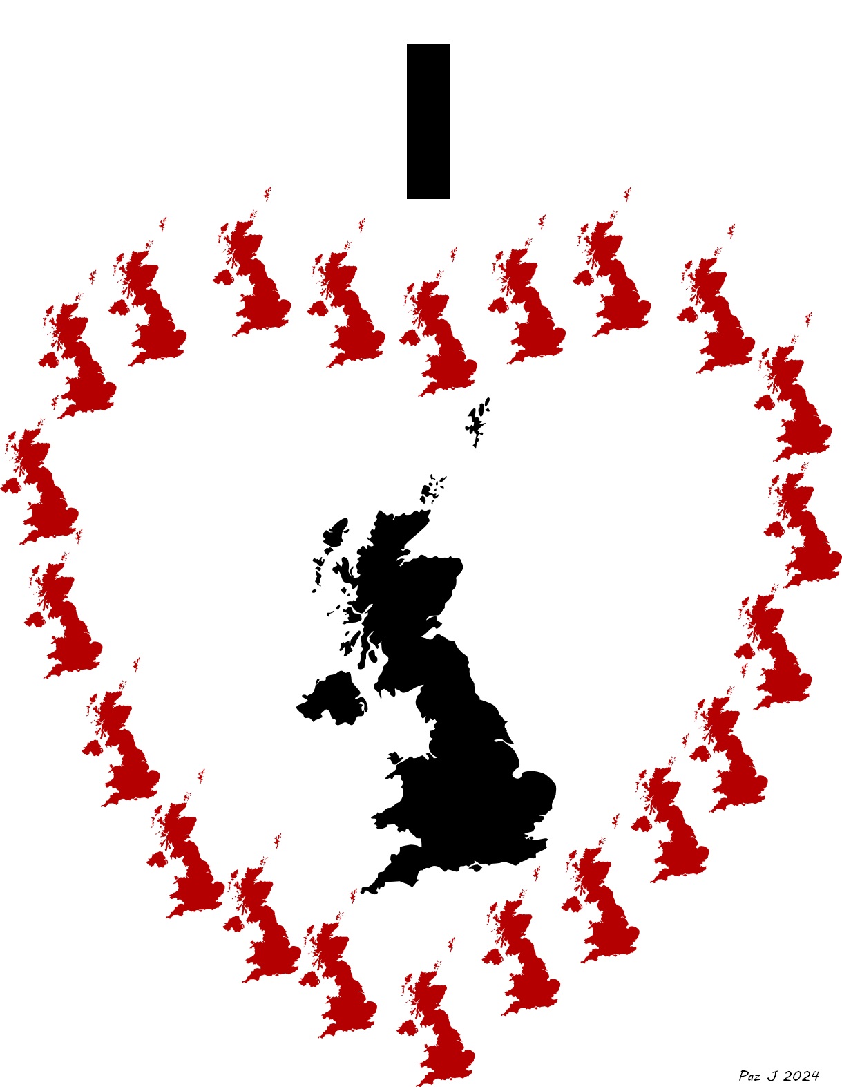 Celebrate your love for the United Kingdom with this striking digital art piece titled “I Love United Kingdom Map.” At its heart is a bold silhouette of the UK in black, surrounded by a red heart crafted from repeating miniature UK map shapes. The “I” above completes the “I ♥ UK” message in a modern, minimalistic style.