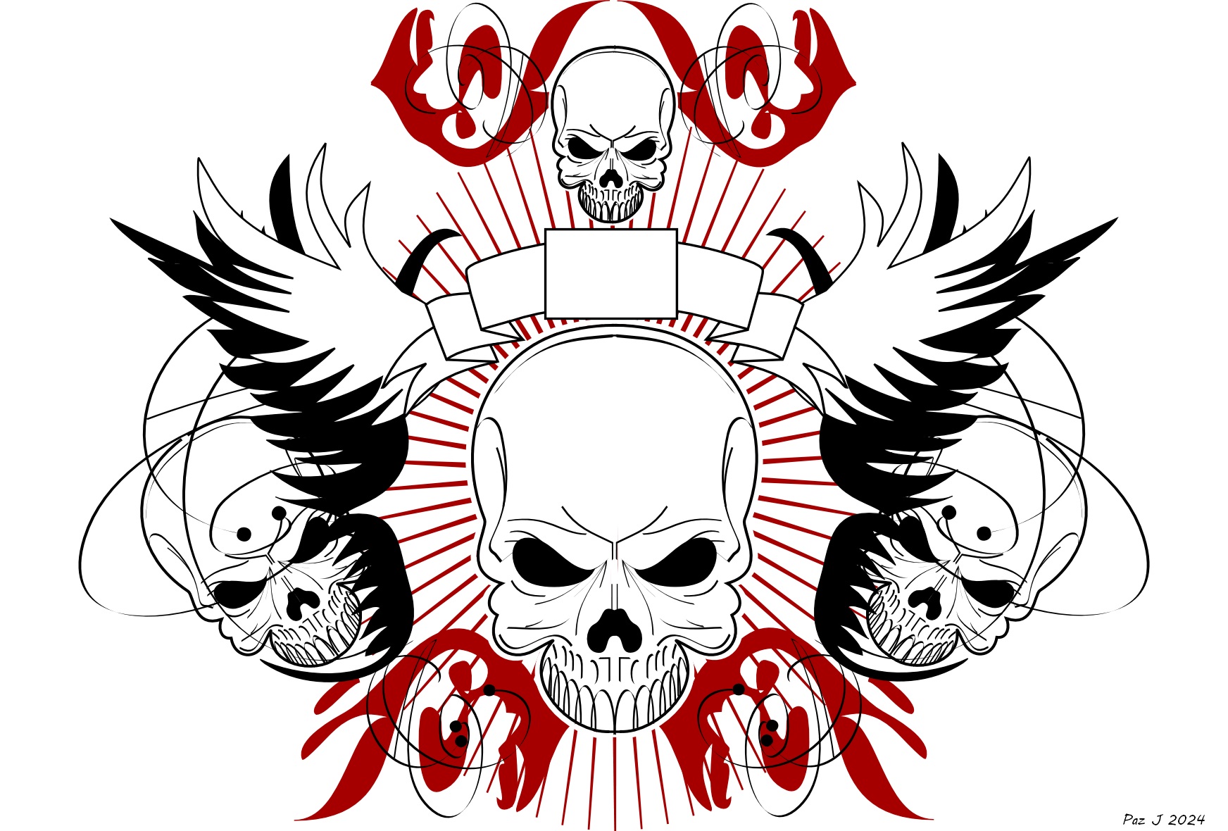 Unleash bold energy with this “Skulls with Wings” gothic-style digital artwork. Dominated by a central skull surrounded by wings, fangs, and fierce tribal patterns, this design fuses the chaos of rebellion with symmetrical artistry. The black-and-red contrast creates a raw, fearless visual perfect for dark decor, tattoo-themed projects, punk rock prints, or motorcycle club gear.
